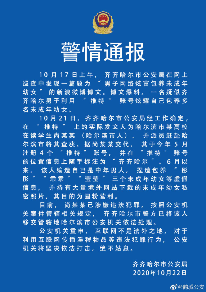 10月21日,齐齐哈尔市公安局经工作确定,在“推特”上的实际发文人为哈尔滨市某高校在读学生尚某某(哈尔滨市人),并派员赶赴哈尔滨市将其查获。据尚某某交代,其于今年5月注册4个“推特”账号,并在“推特”账号的位置信息上随手标注为“齐齐哈尔”。6月以来,该人编造自己是中年男人,捏造包养“彤彤”“乖乖”“莹莹”三个未成年幼女等虚假信息,并持有大量境外网站下载的未成年幼女私密照片,其目的为圈粉营利。